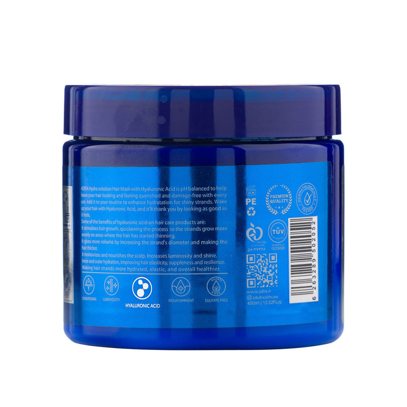 هیالورونیک اسید ماده مفید و اثربخشی است که در آبرسانی عمیق و حفظ رطوبت پوست سر و مو بسیار موثر است.این ماده که در سلامت سلولها موثر است موجب رشد بهتر فولیکول مو و افزایش ضخامت موها میشود. افرادی که موهای دهیدراته، خشک و شکننده دارند میتوانند با استفاده از محصولات مراقبتی مو که حاوی مواد مغذی و موثر مانند هیالورونیک اسید هستند به تامین رطوبت و حفظ آن در تارهای مو و در نتیجه بهبود سلامت و کیفیت موهایشان کمک کنند. ماسکهای مو در دو مدل نیاز به آبکشی و بدون نیاز به آبکشی در دسترس هستند که نوع دوم مناسب بیرون از حمام است. ماسک مو با آبکشی فاقد سولفات حاوی هیالورونیک اسید آدرا موجب آبرسانی و رطوبت رسانی موها شده و از خشکی و شکنندگی مو جلوگیری میکند و موجب افزایش درخشندگی موها میشود. این محصول با دارا بودن مواد مغذی و هیالورونیک اسید مانع وز شدن موها میشود و در افزایش خاصیت کشسانی موها موثر است. ماسک مو با آبکشی فاقد سولفات حاوی هیالورونیک اسید آدرا به نرمی و لطافت بیشتر موها کمک میکند و موجب تثبیت رنگ موها میگردد. این محصول فاقد پارابن و سولفات است و موجب آسیب رساندن به موها نمیشود و برای استفاده هنگام استحمام مناسب است. فاقد سولفات بودن این ماسک مو یکی از مزیتهایی است که آن را به محصولی مناسب برای موهای کراتین و بوتاکس شده تبدیل کرده است.